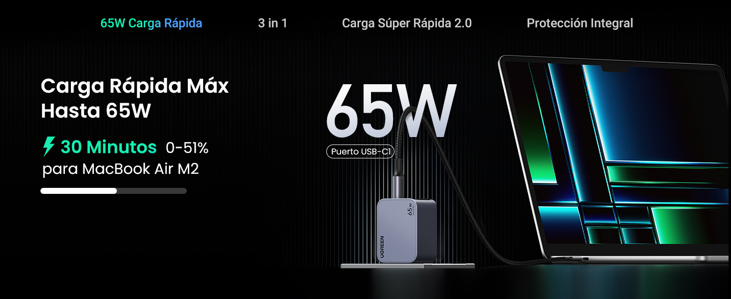 - El puerto USB C1 proporciona una potencia total de 65 W cuando se usa solo. Solo toma 30 minutos cargar el MacBook Air M2 del 0 % al 51 %.