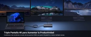 - Permite configuraciones de visualización dual o triple, ofreciendo resolución 4k para ambas configuraciones.