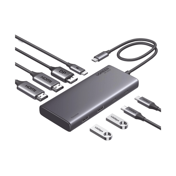 HUB USB-C (Docking Revodok 308) 8 en 1 | 2 Puertos HDMI 4K@60Hz | 1 Puerto DisplayPort 4K@60Hz 2 USB-A 10Gbps) | 2 USB-C (10Gbps) | USB-C PD Carga 100W | Chip de Ultima Generacion | Carcasa de Aluminio.