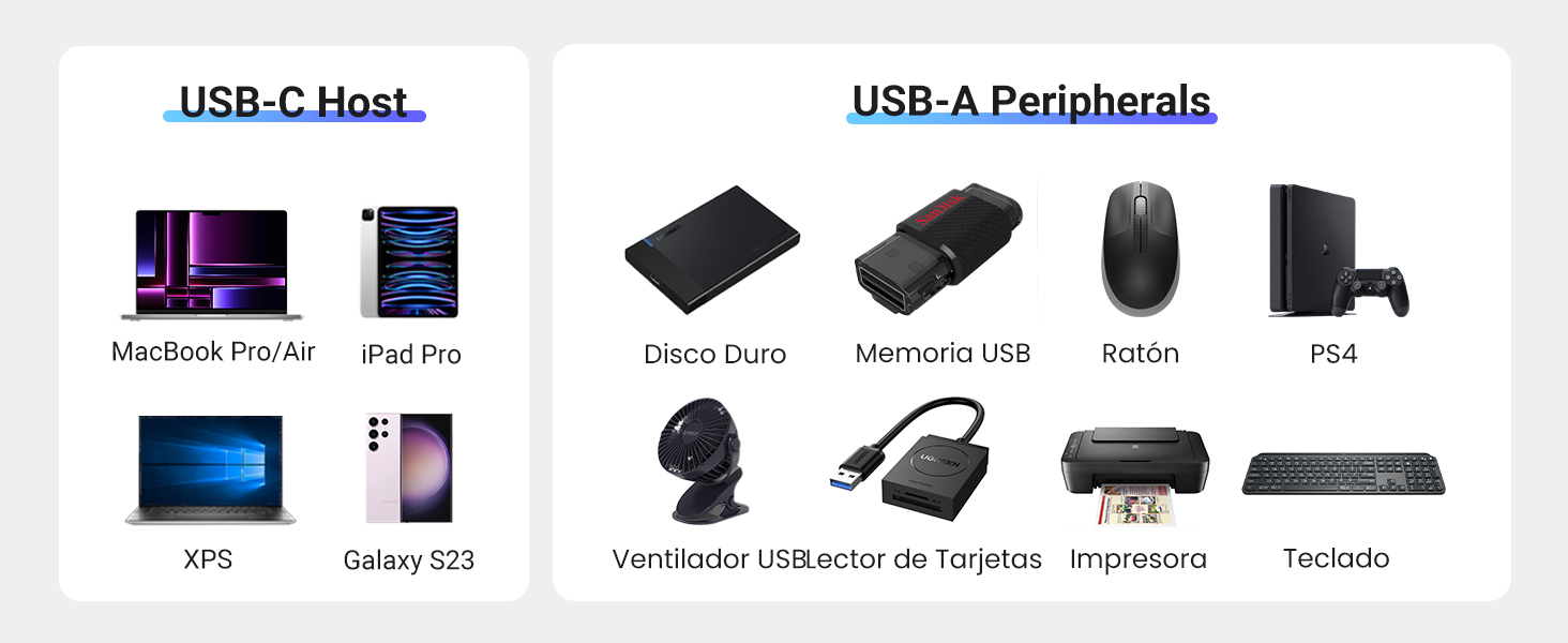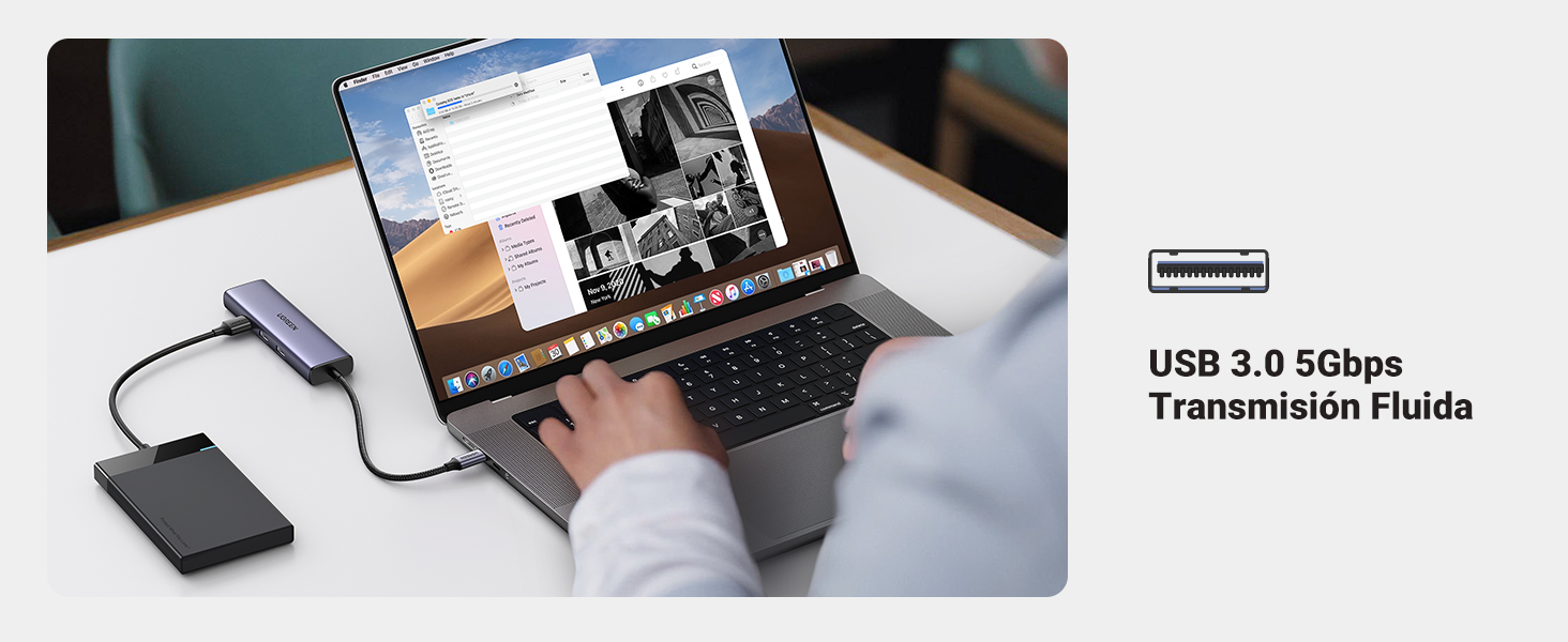 - Conecta cualquier USB periférico como disco duro, USB memoria, teclado, ratón, pendrive, etc., y disfrutará de una velocidad de transmisión de hasta 5Gbps.