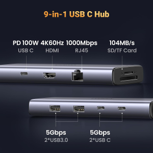 HUB USB-C (Docking Revodok) 9 en 1 | 2 USB-A 3.0 (5Gbps) | 2 USB-C (5Gbps) | USB-C PD Carga 100W | HDMI 4K@60Hz | RJ45 (Gigabit Ethernet) | Lector Tarjetas SD + Micro SD (TF) Simultáneo | Chip de Última Generación | Caja de Aluminio.