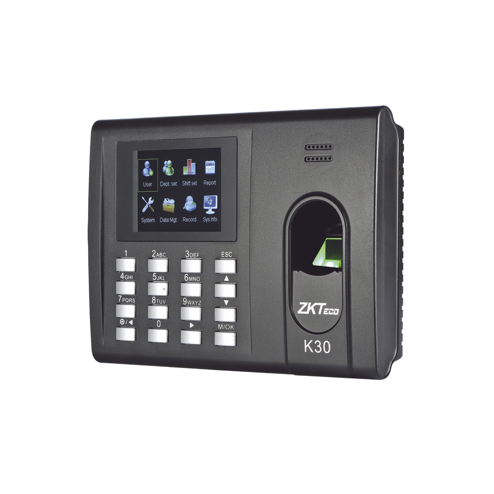 El K30 es una elegante terminal de Tiempo y Asistencia con funciones básicas de control de acceso. Permite la administración de cerraduras eléctricas y botones de salida.