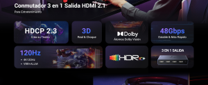 Switch (Splitter) 8K HDMI 2.1 / 3 entradas 1 Salida / Incluye Control Remoto / Soporta 8K@60Hz 4K@120Hz 4K@60Hz 3D / HDR / HDCP 2.3 / Carcasa de Aluminio.